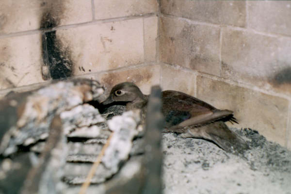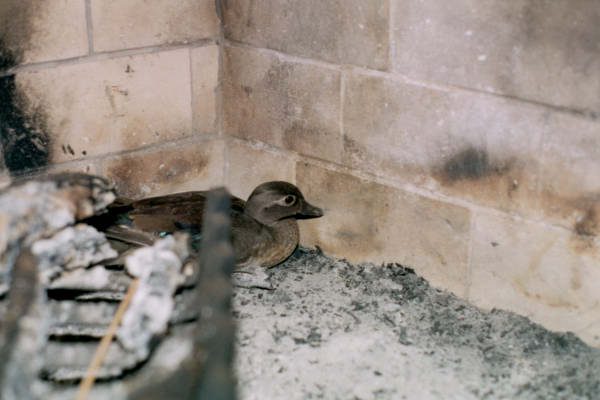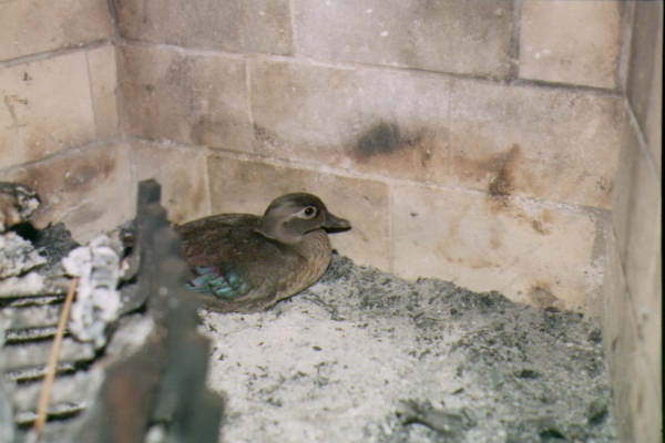 This female wood duck made an unexpected appearance in our fireplace. After a bit of coaxing into a bedsheet, she was released into the stream in front of our house.